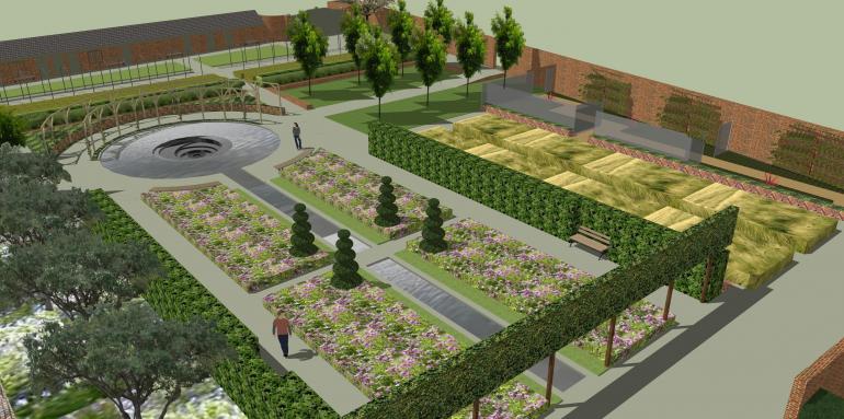My proposals involve bringing together the key productive elements of the Frameyard with the main motifs of Mottisfont Abbey, namely water and roses.